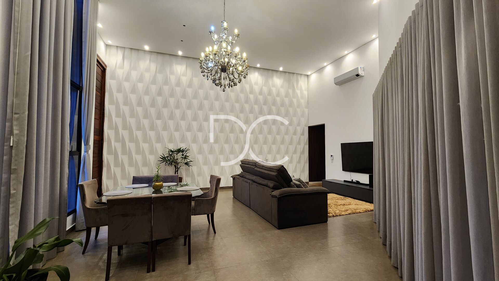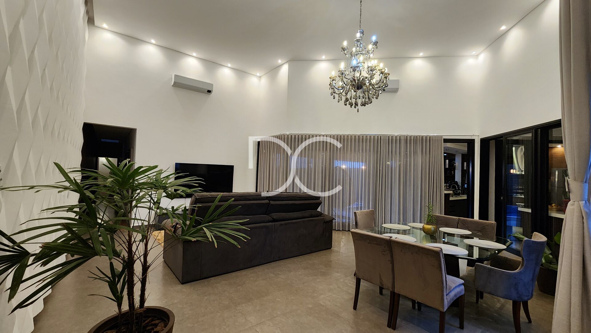 Design Sofisticado: Sala de estar com pé direito de 5,4m integrada ao espaço Gourmet de 55m².